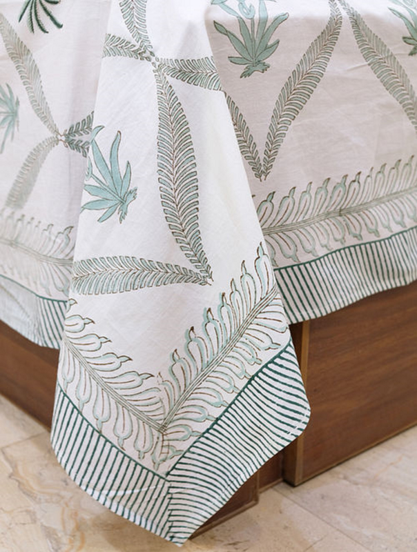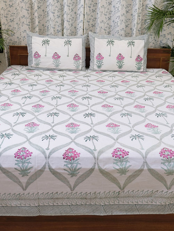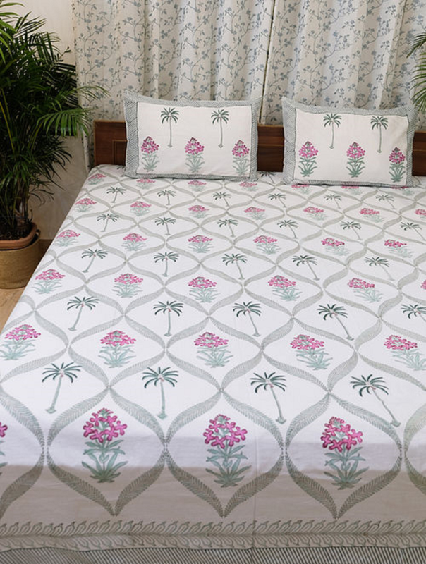 A subtle printed bedspread/bedsheet with reversible pillow cases. The design pattern is stamped by hand, on premium 210TC cotton fabric with hand-carved wood blocks dipped in natural vegetables dyes.