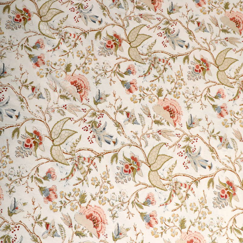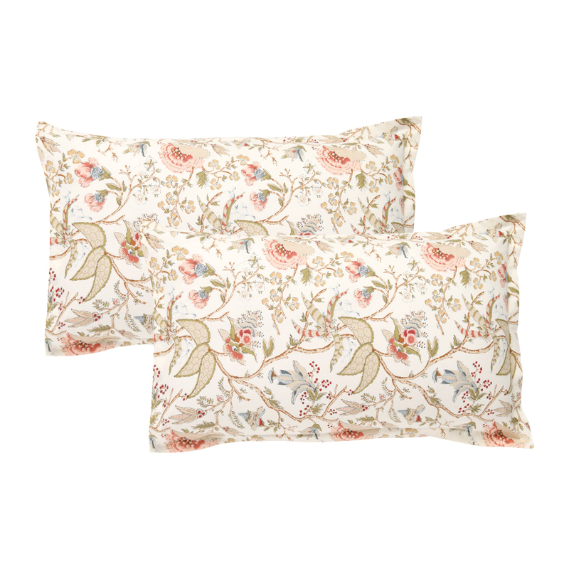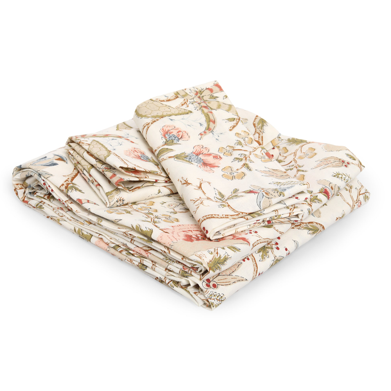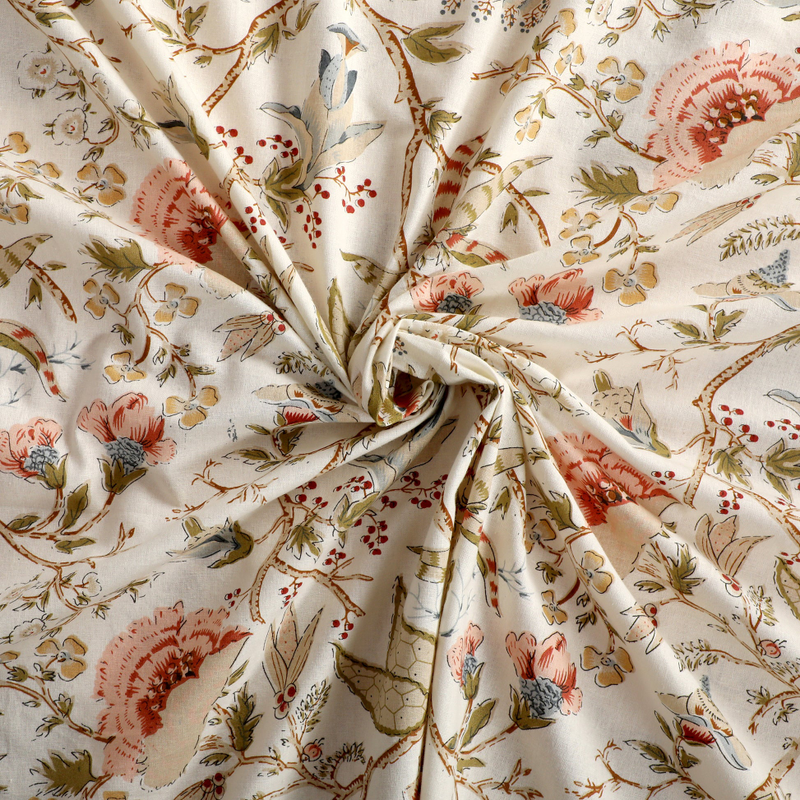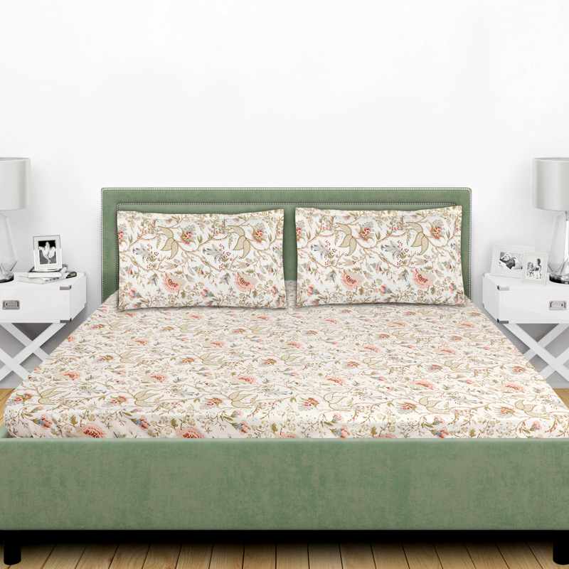 Style your room with this classic Bedsheet adorned with blooming flowers set against a soft off white base on a 100% cotton fabric. Design is inspired by a historical motifs of jaal work with blooming flowers and creepers in subtle tones of green, orange . The soft cotton adds extra coziness and helps you get the most comfortable sleep. Pair the bedsheet with Tasseled Home Ojas Dohar/ AC Comforter to give your bedroom a complete new classic look. The bedsheet is full king size flat type and can fit well on both queen and king size beds. It comes with 2 matching pillow covers.